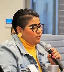 Guiñansaca migrated from Ecuador to Harlem at the age of five to reunite with her parents, who were undocumented. After graduation (Hunter College with a BA in Africana Puerto Rican Latino Studies and Women and Gender Studies) with her background in organizing migrant undocumented communities, she determined that not only policy but art and culture play crucial roles to bring social changes.[3] Since 2013, she worked at Culture Strike as the managing director, an American organization with more than 200 artists of multiple disciplines working for a social change acknowledging and supporting queer, transgender, women, color, migrant emergent artists. In particular, she created the first writing workshops by and for undocumented writers, then co-created the first and only national writing retreat for undocumented writers called UndocuWriters Retreat.[4] In the spring of 2013, she created and helped launch Undocumenting.tmblr.com, a project highlighting the work of undocumented immigrants.[5] Guiñansaca has performed in many different places such as Museo del Barrio, Nuyorican Poets Café, NY Poetry Festival, The Met, Brooklyn Museum, London, Mexico, and featured in Latina Magazine, PBS, Poetry Foundation, etc. She also presented Keynotes, workshops and panels in different Universities.[6][7] In October 2017, she self-published her debut chapbook Nostalgia & Borders and is editing the first undocumented poetry anthology Home in Time of Displacement and currently working on a new chapbook #PapiFemme, which will focus on the central themes of gender and presentation, as well as the queer and immigrant communities.[8] She was named by Teen Vogue as one of the "13 Coolest Queers on the Internet."[9]