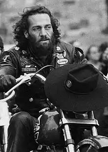 After the spate of publicity the Hells Angels received in 1965, Barger had the club's name copyrighted. The Hells Angels were incorporated as a nonprofit corporation in 1966.[7] Barger and the Hells Angels became associated with the counterculture phenomenon of the 1960s.[1] Between 1966 and 1973, the majority of his legitimate personal income was derived from consulting various film projects.[7][29] He acted as a technical advisor on a series of outlaw biker films beginning with Roger Corman's The Wild Angels (1966).[35] Onscreen, Barger was identified but did not speak in Hells Angels on Wheels (1967) and was one of several members of the Angels who had speaking parts playing themselves in Hell's Angels '69 (1969); he appeared in several additional films. Barger features prominently in Hunter S. Thompson's book, Hell's Angels. He was unimpressed with Thompson, and said of the writer: "When he tried to act tough with us, no matter what happened, Hunter Thompson got scared. I ended up not liking him at all, a tall skinny, typical hillbilly from Kentucky. He was a total fake."[36] Barger and the Hells Angels are also depicted in Tom Wolfe's The Electric Kool-Aid Acid Test (1968), during Ken Kesey's La Honda encampment.[35] Using his fame, Barger opened a chapter in Omaha, Nebraska in 1966, which besides for the chapter in New Zealand, was the first Hells Angel chapter outside of California.[37] In 1967, Barger opened up a Hells Angel chapter in Lowell, Massachusetts, which was the first Hells Angel chapter on the East Coast.[38]
