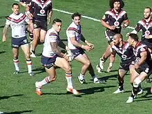 On 13 November 2012, Williams confirmed he would be returning to rugby league after signing a one-year deal with the Sydney Roosters for the 2013 NRL season.[30] His return was undertaken to honour a handshake agreement with Roosters chairman Nick Politis.[31] It took over a month before his contract was officially approved and registered by the Australian Rugby League Commission; he was "frogmarched into League Central to be grilled as part of the probe" into his contract.[32][33] Williams's return coincided with the banning of the shoulder charge, a manoeuvre of which he has been described as the best and most famous exponent.[34][35][36][37]