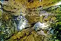 The path goes past the "Millionär" steadily uphill. Through a very narrow passage you come to the third section, the largest cavity of the cave complex. Here sintering is almost completely absent. Only in some places dripstones have formed, including a large cone-shaped stalagmite. On one wall, descending water has created a large sinter formation called "Kanzel mit Madonna". In this room, five large boulders lie on the floor, which have detached from the ceiling and are already partly sintered over. On the ceiling, an area is secured with large iron anchor rods to prevent further rockfall. On the ceiling run several parallel fissures, which are overgrown with sinter. The path describes a large circle in this section and leads to the exit.