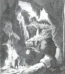 The cave parts connecting behind the maple hole had the names Klausstein Cave, Sophie Cave and Kochshöhle, after the discoverer. The name Kochshöhle disappeared around 1840, the name Klausstein Cave persisted alongside Sophie Cave until around 1900.[11] Theodor Rothbart published a portfolio of three lithographs depicting the three main sections of Sophie Cave in 1856. In 1902, the cave was surveyed for the first time by Major Adalbert Neischl with a total passage length of 284 meters.[2] This did not include some side passages, some of which were only made accessible later.