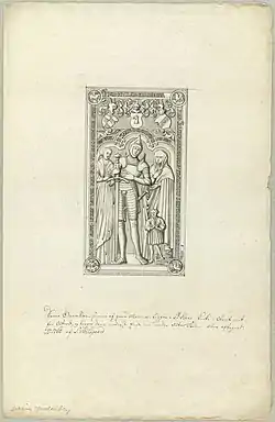 Sophie Lykke seen on her husband's ledgerstone in St. John's Church in Odense. The other woman is Edel Bille, Hardenberg's first wife. Drawing by Søren Abildgaard, 1760.