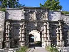 Show gate of Wülzburg Castle with the coats of arms of Sophie and her husband