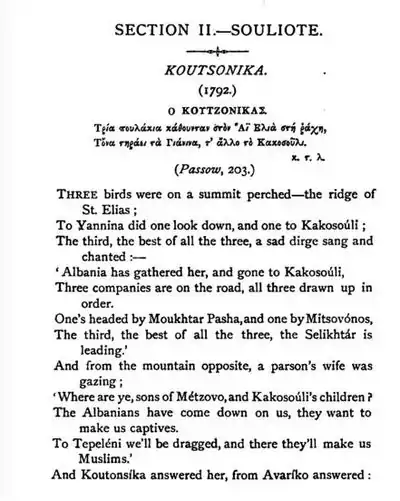 - ↑ Zambelios Spyridon, Asmata Demotica tes Hellados (Greek Folk Songs), 1852. In Greek language. Some of the Souliotic songs are in pp. 644 (Death of M. Botsaris), 646 (Death of Kitsos Botsaris), 689 (The Treason of Delvino), 691 (Ali Pasha), 692 (Fall of Souli) etc.