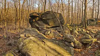 While located in a suburban section of central New Jersey, Sourland Mountain is a heavily wooded and rocky place. The Ridge Trail can be quite difficult and technical in spots. At the top of the ridge, there are some very large and beautiful exposed boulders. Roaring Brook passes through the southern edge of the preserve. While not officially a part of the preserve, hikers often visit the brook to see one of the finest boulder fields in New Jersey.