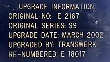 On some early rebuilds a small plate, about the size of a cigarette packet and engraved with the upgrade information was attached on the cab wall in Cab 1 next to the compressor ventilation opening. The specimen depicted is in error about the original Class 6E series, which was S11 in the case of no. E2167.