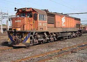 The Class 34-600 type GT26MC diesel-electric locomotive was designed by General Motors Electro-Motive Division and built for the South African Railways (SAR) by General Motors South Africa (GMSA) in Port Elizabeth. One hundred locomotives were delivered between December 1974 and July 1976, numbered in the range from 34-601 to 34-700.[1][2][3]