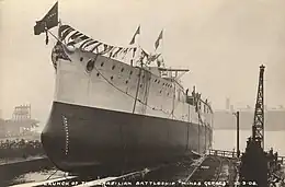 Brazil's Minas Geraes, the lead ship, was laid down by Armstrong on 17 April 1907, while its sister São Paulo followed on 30 April at Vickers. Completion of the partial hull needed to launch Minas Geraes was delayed by a five-month strike to 10 September 1908. São Paulo followed on 19 April 1909.[85] Both were christened in front of large crowds by the wife of Francisco Régis de Oliveira, the Brazilian ambassador to the United Kingdom.[86] After fitting-out, the period after a warship's launch where it is completed, Minas Geraes was put through multiple trials of the speed, endurance, efficiency, and weaponry of the ship in September, including what was at that time the heaviest broadside ever fired off a warship. Minas Geraes was completed and handed over to Brazil on 5 January 1910.[87] The trials proved that the blast from the class' superfiring upper turrets would not injure crewmen in the lower turrets. The ship itself managed to reach 21.432 knots (24.664 mph; 39.692 km/h) on an indicated horsepower (ihp) of 27,212.[88] São Paulo followed its classmate in July, after its own trials at the end of May, where the ship reached 21.623 knots (24.883 mph; 40.046 km/h) at 28,645 ihp.[89]