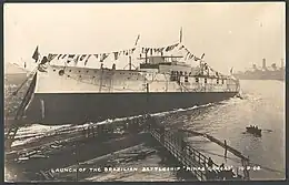 This move was made with the large-scale support of Brazilian politicians, including Pinheiro Machado and a nearly unanimous vote in the Senate; the navy, now with a large-ship advocate, Rear Admiral Alexandrino Faria de Alencar, in the influential post of minister of the navy; and the Brazilian press.[27] Still, these changes were made with the stipulation that the total price of the new naval program not exceed the original limit, so the increase in battleship tonnage was bought with the previous elimination of armored cruisers and decreasing the number of destroyer-type warships.[28] The three battleships on which construction had begun were scrapped beginning on 7 January 1907, and the design for the new dreadnoughts was approved on 20 February.[29] Newspapers began covering the Brazilian warship order in March,[30] and Armstrong laid down the first dreadnought on 17 April.[31] The full order—including all three dreadnoughts and the two cruisers—was reported by the New York Herald, Daily Chronicle, and the Times later that year.[32]