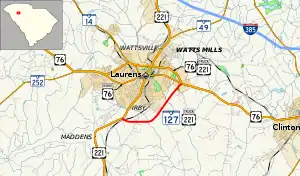 South Carolina Highway 127 (SC 127) is a 3.620-mile-long (5.826 km) state highway in the U.S. state of South Carolina. The highway functions as a truck route of Laurens. In fact, it is the through route for truck traffic along U.S. Route 221 (US 221) and is concurrent with US 221 Truck for its entire length.