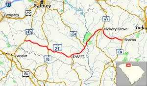 SC 211 begins at an intersection with SC 150, north of Pacolet in Cherokee County, going easterly along Asbury Road to Asbury, where it connects with SC 18. Splitting from SC 18 onto Gowdeysville Road, it connects with SC 105 in Saratt. Solo again, when it splits from SC 105 with Hickory Grove Road, it crosses the Broad River and into York County. At Hickory Grove, it connects briefly with SC 97, before continuing southeasterly to Sharon, where it ends at an intersection with SC 49.[3]