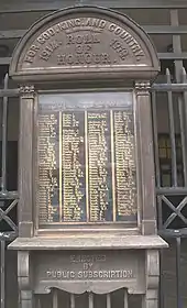 South Cave Parish Council, which was formed in 1896, first used the market hall as its meeting place from 1906.[3] After the First World War, a roll of honour was installed on the front of the town hall to commemorate the service of local people who had taken part in the war.[9] In 1935, as part of events intended to commemorate the Silver Jubilee of George V, the original faces of the clock were replaced with illuminated dials, the lighting for which was financed by public subscription.[10]