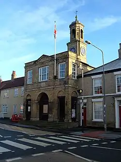 The new building was designed in the neoclassical style, built in yellow brick with ashlar stone dressings and was completed in 1796.[1][5][6] It was arcaded on the ground floor, so that markets could be held, with an assembly room on the first floor. The design involved a symmetrical main frontage with three bays facing onto the Market Place; the central bay, which slightly projected forward, featured a large opening on the ground floor with an oval cartouche above inscribed with the words "Erected in the year 1796".[1] There was a central three-part sash window with glazing bars on the first floor and, at roof level, a dentiled pediment with a cartouche, containing a floral motif, in the tympanum. The outer bays contained narrower openings on the ground floor, sash windows on the first floor and a dentilled cornice above. Internally, the principal room was the assembly hall on the first floor which was initially used as a room for collecting rents.[3]