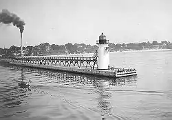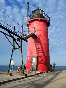 The South Haven South Pierhead Light is a lighthouse in Michigan, at the entrance to the Black River on Lake Michigan. The station was lit in 1872, and is still operational. The tower is a shortened version of the Muskegon South Pierhead Light, and replaced an 1872 wooden tower. The catwalk is original and still links the tower to shore: it is one of only four that survive in the State of Michigan.[5]