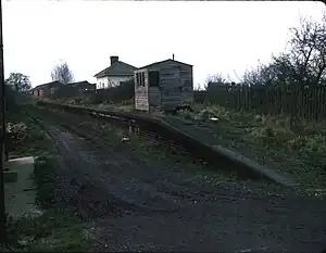 The station remained much in the same appearance until its closure.[13] It was thereafter converted into an attractive dwelling complete with central heating, mains water and electricity.[17] It was sold for £8,000 in February 1975 and planning permission was granted for the demolition of the station and the construction of a new bungalow over the trackbed.[18][19] Although a large section of the embankment near the station has been removed by farmers, it is possible to reach the site via a public footpath which runs parallel to the former line.[17] The station house still remains and is now named "Old Crossing".[11] In 1992, the old food store building, long since out-of-use, was still standing.[19]