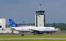 jetBlue airliner at PWM, viewed from the South Portland side of the runway, 2009.