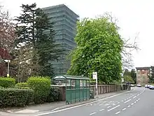 The stables and servants' quarters were demolished in 1961[5] and in 1964 a concrete tower extension was added to the hall, incorporating a bar and dining hall area. The tower contained 180 student rooms over its 17 floors and was 48.7 metres high,[23] making it the 10th-tallest building in Southampton in December 2017.[24] Despite some later claims to the contrary,[20] there is no contemporary evidence that these extensions were intended to be temporary.
