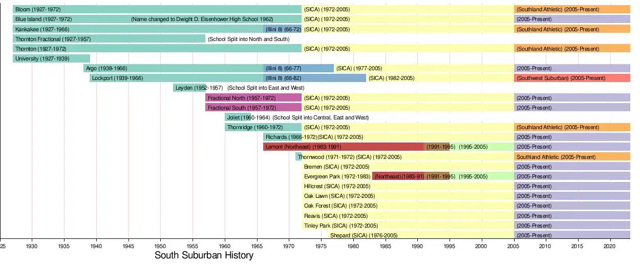 Shortly after this, twelve more schools split off to form the South Suburban Conference.[7] Those schools included; Argo, Bremen, Eisenhower, Evergreen Park, Hillcrest, Lemont, Oak Forest, Oak Lawn, Reavis, Richards, Shepard, and Tinley Park,.