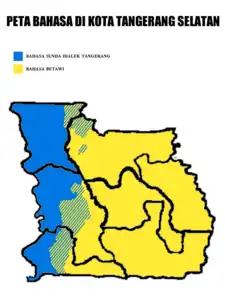 The dominant languages used in South Tangerang are Betawi and Tangerang Sundanese languages. Betawi is spoken in almost all areas of South Tangerang, except in the western part along the Cisadane River. Meanwhile, Sundanese is spoken in the west along the Cisadane River, which is predominantly used in villages on the banks of the river, especially in North Serpong. In several communities located in the western part there are also several areas undergoing a language shift, which are mostly found in Serpong, Setu, and a small number of villages in the western part of Pondok Aren.[7] In fact, there is a village in Setu district namely the Keranggan Ecotourism and Sundanese Culture Village (Kampung Ekowisata dan Budaya Sunda Keranggan), where almost all the people used to speak Sundanese (currently it is only spoken predominantly in 2 RT).[8][9]