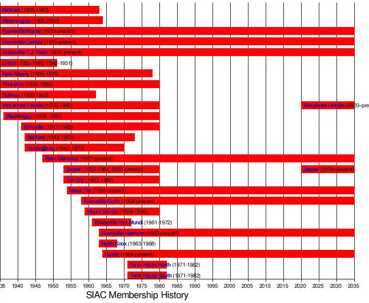 The Southern Indiana Athletic Conference (SIAC) is a high school athletic conference based in Evansville, Indiana. Five of the conferences 10 schools; Bosse, Central, Harrison, North, and Reitz; comprise the public Evansville Vanderburgh School Corporation. Mater Dei and Memorial are private Catholic high schools ran by the Roman Catholic Diocese of Evansville, and the largest member is Castle, a public school located in neighboring Newburgh in Warrick County under the Warrick County School Corporation. The league was founded in 1936, and at one point stretched far across southern and western Indiana: from Mount Vernon in the west to New Albany in the east, and from Evansville in the south to Terre Haute in the north. Jasper and Vincennes Lincoln announced in May 2019 that they would leave the disbanding Big Eight Conference to rejoin the Southern Indiana Athletic Conference beginning with the 2020–21 season.