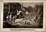 Patting its own back a bit, Harper's Weekly ran an unbylined feature on Nast in May that described Amphitheatrum Johnsonianum and Southern Justice as "very significant. They tell their own story. They represent not accidents, such as might happen anywhere, but a system of brutal crime...persecution and destruction of loyal citizens of the United States...These pictures are the argument of the Reconstruction bill. The civil law of Rebel states, made and administered by ex-rebels, is found to be no defense against committed upon loyal men, and if those men are to be protected, it must be for the present by the national arm."[3] In images like Southern Justice, Nast represented "the brutal treatment of Negroes, Unionists, and Republicans by unregenerate Southern whites" and the Northern expectation that after the harvest of death that "the ideals fought for would be translated into reality" during the Reconstruction Era.[4]