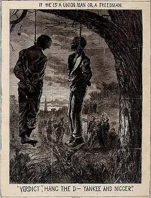 Southern Justice is a multi-panel political cartoon by Bavarian-American caricaturist Thomas Nast, advocating for continued military occupation of the U.S. South to protect freedmen, Unionists, and Republicans from violence.[1] Published as a double-page spread in the March 23, 1867 issue of Harper's Weekly, Southern Justice is one of a series of images Nast produced in 1866 and 1867 that "emphasized freedmen's potential in American life...the suffering of freedmen, the barbarity of night riders, and the dangers of Johnson's reconstruction policies to real men and womenpeople whose potential could be lost through northern inaction."[2]