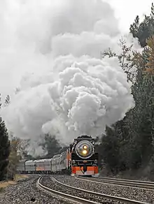 Following a two-year hiatus needed to accommodate the locomotive's mandatory 15-year inspection and overhaul, SP 4449 returned to service on November 25, 2015.[21] From 2016 to 2019, SP 4449 pulled several excursion trains during each year.[22] In late 2019, the locomotive was scheduled to haul the annual 40-minute round-trip Oregon Rail Heritage Foundation "Holiday Express" fundraiser trains through the Springwater Corridor and along Portland's Oaks Bottom Wildlife Refuge, along the Willamette River, during November and December of that year.[23]