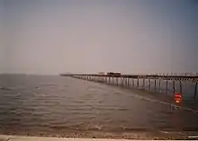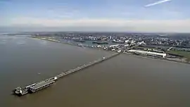 At 1,108 m (3,635 ft),[1] Southport Pier is the second longest in Great Britain.[lower-alpha 1][4] As a result of silting in the water channel, part of the pier now passes overland before reaching the beach, as the silt has allowed land beneath the pier to be reclaimed.[5] The entrance starts at Promenade Road and follows a route inland next to Princes Park, before crossing over Marine Drive and meeting the beach at approximately half-way along its length.