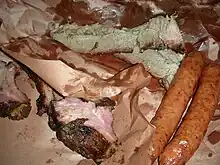 It is known for serving "Elgin hot guts",[8] a type of beef sausage invented by Bud Frazier who worked at the restaurant between 1902 and 1971.[2] Hot guts are made with beef and beef tallow, and are seasoned with salt, black pepper and cayenne pepper.[9][10] The recipe is influenced by the settlement of Germans in Texas, who brought a distinct style of sausage-making to Central Texas.[11] The sausages are smoked over oakwood, and sold both fresh and precooked. The market ships meat to chain supermarkets such as H-E-B and Walmart.[12]