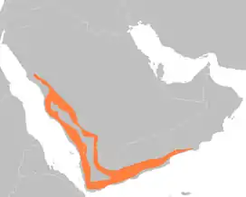 The ecoregion is home to the critically-endangered Arabian leopard (Panthera pardus nimr).[11] Other mammals include the caracal (Caracal caracal), Arabian wolf (Canis lupus arabs), hamadryas baboon (Papio hamadryas), red fox (Vulpes vulpes), long-tailed jird (Meriones crassus), Cape hare (Lepus capensis), and Indian crested porcupine (Hystrix indica).[12][13]