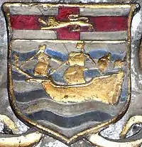 - ↑ The chief is identical, but the field (the sea) is here shown barry wavy of nine argent and azure (perhaps identical to a sea proper) and some of the charges are not visible, such as the dolphin's head