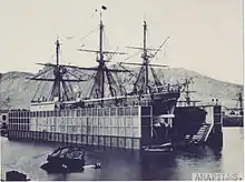 Arapiles was 280 feet (85.3 m) long at the waterline, had a beam of 52 feet 2 inches (15.9 m) and a draft of 17 feet (5.2 m). The ship displaced 3,441 long tons (3,496 t). She had a single trunk steam engine that drove the propeller using steam provided by six boilers that exhausted through a single funnel. The engine was designed to produce a total of 2,400 indicated horsepower (1,800 kW) which gave the ship a speed of 8 knots (15 km/h; 9.2 mph).[1] For long-distance travel, Arapiles was fitted with three masts and ship rigged.[2]