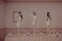 The second chorus has the girls dancing on the table, knocking several pieces of food and Tupperware onto the ground. A-Chan is seen lying down on a pillow, whilst Kashiyuka balances a book and an apple on her head. Both of these scenes have them throwing several pieces of food onto the table. Nocchi is seen at the dining table, holding a fork and listen to music through her headphones. She witnesses a small door underneath a stool, opens it, and sees a small green room. In the room, a blurred image of a cup starts to become clear, and holds small candy. As the girls eat the pieces of candy, their cream-coloured dresses turn into the outfits from the cover sleeve from the single.[15] The girls start dancing in the fish bowl, surrounded by glittery lights. The final scene has the girls looking through the small door again, only to witness the dining room table empty; the small cup with candy appears in beige colouring rather than full-on vibrancy.[15]