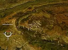 The unusual geological structure has been a puzzle since the 1950s, but it was not until shatter cones were discovered it the centre in the late 1970s that it was realized that it was an eroded impact structure.[2] The central area bearing shatter cones is interpreted as the relic of a central uplift with the outer limits of disturbance confined to a subcircular area about 11 x 13 km in diameter; the original crater may have been slightly greater than this due to the depth of erosion.[3] The asymmetry of the structure lead some geologists to conclude that the projectile had a very low angle trajectory from the north or northwest,[3] while others suggest that the asymmetry may be at least partly due to the effect of pre-existing topography.[2]