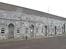 Two alternative proposals had been made for accommodation within the fort.[19] One envisaged six barrack blocks, one of which was actually constructed in the fort, this being the officers mess block, The ground floor of these blocks consisted of a series of bombproof brick vaulted rooms. The first floor was slate-roofed and open to destruction in the event of a bombardment. The second proposal was for 6 sets of bombproof casemates set into the ramparts. Two such sets of casemates were actually constructed, these being the north-east and north-west casemates. The second accommodation block to be constructed, the A Block, shows a divergence from the original plan in that the bombproofing is incorporated into the roof. The ground floor of a third block, the B Block, was intended to follow the design of the A block, was erected before the first phase of construction ended (circa 1817). The four magazines were also constructed around this time. A large workforce was employed in the construction, and included both troops and civilian workmen.[15]