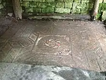 Structural remains had been noticed in the wood before 1877, but it was only in 1882 that workmen, searching for stone, uncovered one of the rooms of the villa.[4] The site was in the ownership of Emma Dent, the owner of nearby Sudeley Castle, who had a mosaic lifted and moved to the castle.[5] The site was subsequently excavated by the antiquarians John Henry Middleton and William Bazeley.[4] For two years the site lay open, during which time it was damaged by frost, rabbits, and visitors.[5] In response to the damage, Emma Dent chose to partially rebuild the walls, up to 1.8 metres high in places on the east and south sides, and to reconstruct two of the remaining mosaics and cover them with wooden sheds.[4] The huts had become ruinous by 1945,[1] and in 1976 it was reported that "the sheds have now collapsed and the remains are suffering from weather and from the encroaching wood."[4]