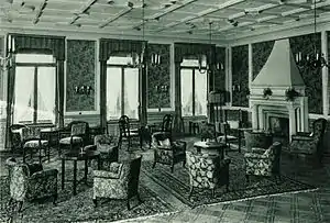 Since the 1891 enlargement, 16 of the hotel's 66 guest rooms had been provided with their own wood-burning stoves.[9] Guests accommodated in these rooms were billed for using the stoves according to the number of crates of fire wood consumed. However, the room stoves were only ever intended to compensate for short episodes of cold weather, and it would not have been considered practical to operate them on a sustained basis through a winter season. For the 1906/07 winter season, therefore, a central heating system was installed,[18] which was then extended in 1913.[19] New elaborate illustrated brochures were produced, with French and English language versions together with the German ones, in order to draw in more hotel guests for the winter season. New or expanded activities available included skiing, tobogganing, skijoring, ice skating and excursions by horse sled.