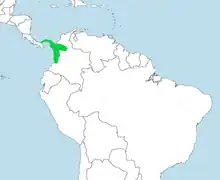 The nominate subspecies of spot-crowned barbet is found from Panama's Veraguas Province east to the Canal Zone. C. m. rubrilateralis is found from eastern Panama into Colombia, east to Antioquia Department and south to Valle Department. It usually inhabits wet primary forest in both lowands and hill country and is also found in secondary forest. It is mostly found at elevations between 600 and 900 m (2,000 and 3,000 ft) but up to 1,200 m (3,900 ft) in a few areas.[3]