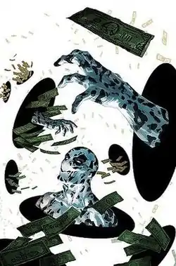 Spot later formed a short-lived team with Gibbon, Grizzly, and Kangaroo called the Spider-Man Revenge Squad, which was better known as the Legion of Losers. This team fell apart when Spider-Man carted the Spot and the Kangaroo to jail for bank robbery, and Grizzly and Gibbon left the group as they disagreed with their teammates' more ruthless approach.[8] Some time later, the Spot was captured by an organization called the Gideon Trust and forced to open a portal to the Negative Zone. Gideon Trust hoped to investigate and exploit the natural resources of the Zone for their own purposes, but were defeated by the Fantastic Four who were trapped there.[9] The Spot later helped Tombstone escape from a maximum security prison. In return, Tombstone snapped his neck.[10] Despite this, he reappeared alive months later and arranged a meeting with Slyde. Both were upset at the reports of Hydra capturing or killing lesser-known supervillains. When the Spot arrived, both he and Slyde were quickly captured by a brainwashed Elektra. They were then resurrected by the Hand to join Hydra's army of superhumans and assault the S.H.I.E.L.D. helicarrier, however the Spot was taken out by Wolverine during the attack.[11] The Spot returned in "Civil War: War Crimes" where he was recruited as part of Hammerhead's supervillain army. However, as Iron Man and S.H.I.E.L.D. attacked their forces, it remains unknown if the Spot was incarcerated with other villains and somehow escaped, or was among the casualties of the raid.[12]