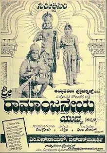 Sri Ramanjaneya Yuddha is a 1963 Indian Kannada-language film, directed by M. Nageshwara Rao and M S Nayak. The film stars Rajkumar, Udaykumar, K. S. Ashwath and Dikki Madhavarao. The film has musical score by Satyam who made his debut through this film.[1][2][3] The title card of the movie revealed that this was Rajkumar's 50th movie.[4] The movie was remade in Telugu in 1975 as Sri Ramanjaneya Yuddham starring N. T. Rama Rao.