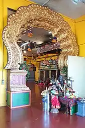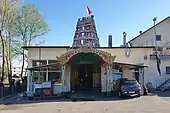 The temple is located in a pre-existing warehouse, with floor heating, new sewer lines and a new kitchen subsequently installed. The main altar is located in the middle of the biggest room. Several lions, the mounts of the Hindu Goddess Durga, enthrone on the dome above the decorated portal, as well as the deities and the other colorful altars with their small turrets, which were built on the walls of the room – they all were shipped from India.[2] The Temple is located at Ediker Strasse 24, 8635 Dürnten.[1]