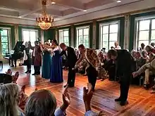 Dr. Juto, ophthalmologist and an avid classical music fan, decided in 2005 to build a music pavilion on the Stålboga premises with the idea of staging intimate music events of the highest possible standard. As a starting point Dr. Juto was able to acquire the late 18th century state room interiors of the De Geer family's great city palace in Stockholm, razed in 1926 to make way for the new headquarters of Swedish industrialist Ivar Kreuger's match business, the predecessor of Swedish Match. The interiors were designed by the same interior designers that were at the same time designing the interior of the Royal Palace in Stockholm: Jean Eric Rehn, Jean Baptiste Masreliez, Adrien Masreliez, Christoffer Gjörwell and Nicodemus Tessin the Elder.[4] At the time of construction of the music pavilion the interior decorations had then been stored for 80 years at the De Geer family's estate at Lövstabruk.[5]
