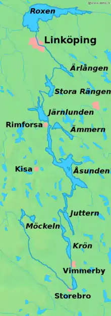 It passes through Vimmerby, Kisa, and Linköping. A great deal of the river is extended to a canal, Kinda Canal. A railway takes the same course as the river.