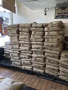 In the front of the bakery, by the window, piles of flour that are needed to make the bagels are displayed