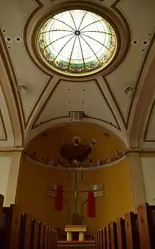 A new church was dedicated on November 24, 1910, by Bishop Thomas F. Lillis. The school was relocated to the parish property the same year. St. Agnes High School, now Springfield Catholic High School, was established in 1916. The stained glass windows of Our Lady of the Lillies and Saint Agnes were created by Stanley Uthwatt and Bernard Schahuber in 1921. In 1935, a fire in the basement of the church building destroyed the wood floor and a new concrete floor was installed. A new high school building was constructed in 1938. During World War II, the old high school building was used as a U.S.O. Center. After the war, it was used as a parish recreation center before it was torn down. The Solemn High Mass of Christmas in 1954 from St. Agnes was the first televised religious service from a church on Springfield.[1]