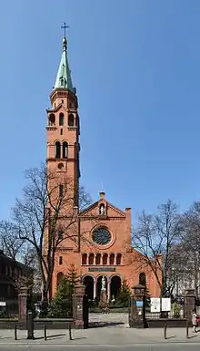 The church was built of red clinker brick with stone architectural details in brown-red and beige. There are three naves, in a basilica enriched with a high turret in the north-east corner. An elongated, closed choir is in the north-west. Flanking it are a couple of annexes with narrow antechambers: the north vestry and the south chapel. The two-storey facade is flanked to the left by a tower, and on the right by a chapel annex. Above the portico, resting on three arcades, is a strip of six semi-circular niches.