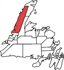 It included the communities of St. Barbe, Bartlett's Harbour, Bellburns, Bird Cove, Black Duck Cove, Blue Cove, Brig Bay, Castor River North, Castor River South, Cow Head, Daniel's Harbour, Eddie's Cove West, Forrester’s Point, Glenburnie-Birchy Head-Shoal Brook, Hawke's Bay, New Ferrole, Norris Point, Parsons Pond, Pigeon Cove, Plum Point, Pond Cove, Port aux Choix, Port Saunders, Portland Creek, Reef's Harbour, River of Ponds, Rocky Harbour St. Pauls, Sally's Cove, Shoal Cove West, Three Mile Rock, Trout River, Wiltondale, Woody Point.[3]