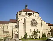 The current Lombard Romanesque church building was built in 1927. It was designed by architect Ross Montgomery.[5] The church is constructed of reinforced concrete with a high altar made of carved French Caen stone.[1] In July 1927, as the structure was being built, the Los Angeles Times reported: