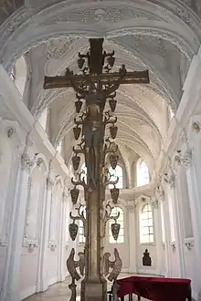 The church was badly damaged during the Second World War in an air raid on 2 January 1945. The roof on the nave, crossing, transepts and choir collapsed and the outer walls were badly damaged. It was rebuilt between 1946-59 by Nuremberg architect Rudolf Gröschel[3] in an economically interpretative way, as the costs to reconstruct the baroque interior with its ornate detail was unaffordable at the time.