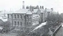 Barrow's first hospital located close to St. George's Square was completed in 1866; however, the town's rapid and sudden growth meant that the tiny St. George's Hospital, with only a handful of beds, soon became redundant.[2] A new much larger hospital named North Lonsdale Hospital was constructed on the northern corner of St. George's Square.[2] Design by local architects Paley and Austin the building was built between 1885 and 1887, with another wing added in 1899.[3] North Lonsdale served as the town's primary hospital for almost a century, with no less than seven wards including dozens of beds, an operating theatre, dispensary and laundry. Other hospitals in the town during the 20th century were located in Roose, Risedale and Devonshire Road, the latter two specialising in maternity and infectious diseases respectively. North Lonsdale Hospital finally closed down in 1989 after all services had been transferred to the modern Furness General Hospital off Abbey Road. Despite its listed status the entire complex was demolished in the mid-1990s to make way for a retirement home. Planning permission was approved in 2013 for housing units to be constructed on the remainder of the site.[3]
